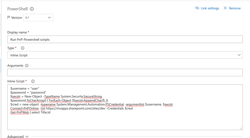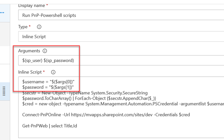 As type of script you can select either File Path (in that case your .ps1 should to be in repository) or Inline script. Let’s use inline for simplicity. The script is very basic, it prints web’s Title and Id: