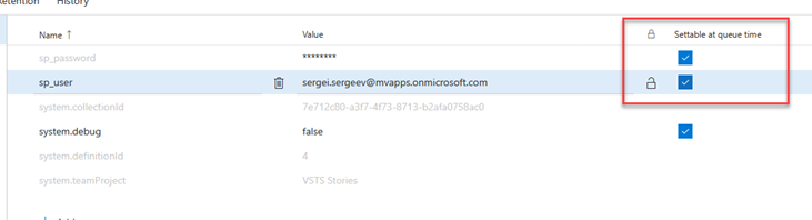 One thing still need to improved – hardcoded username and password. We’ll store it inside build variables. Under build definition click on variables and add two variables – sp_user and sp_password. Click on lock icon to make password masked, don’t forget to check Settable at queue time: