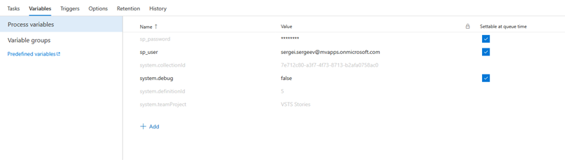 Under Variables section of the build I’ve created two variables – sp_user and sp_password. These parameters are passed to my gulp call: