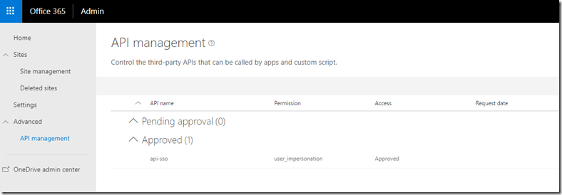 3. In order to approve permission request, go to your SharePoint admin site and switch to new experience. In the left you will see API management link. From API management interface you can approve or reject API requests: