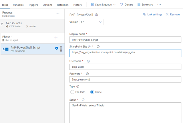 - You can use either inline scripts or put the script in the file and use File Path option. You can have multiple PnP-PowerShell steps in your build definition. In that case PnP-PowerShell module will be loaded only once (for the first task). That’s it!