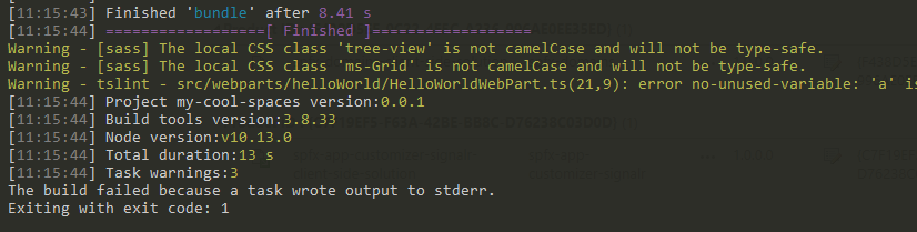The build failed because a task wrote output to stderr. Exiting with exit code: 1