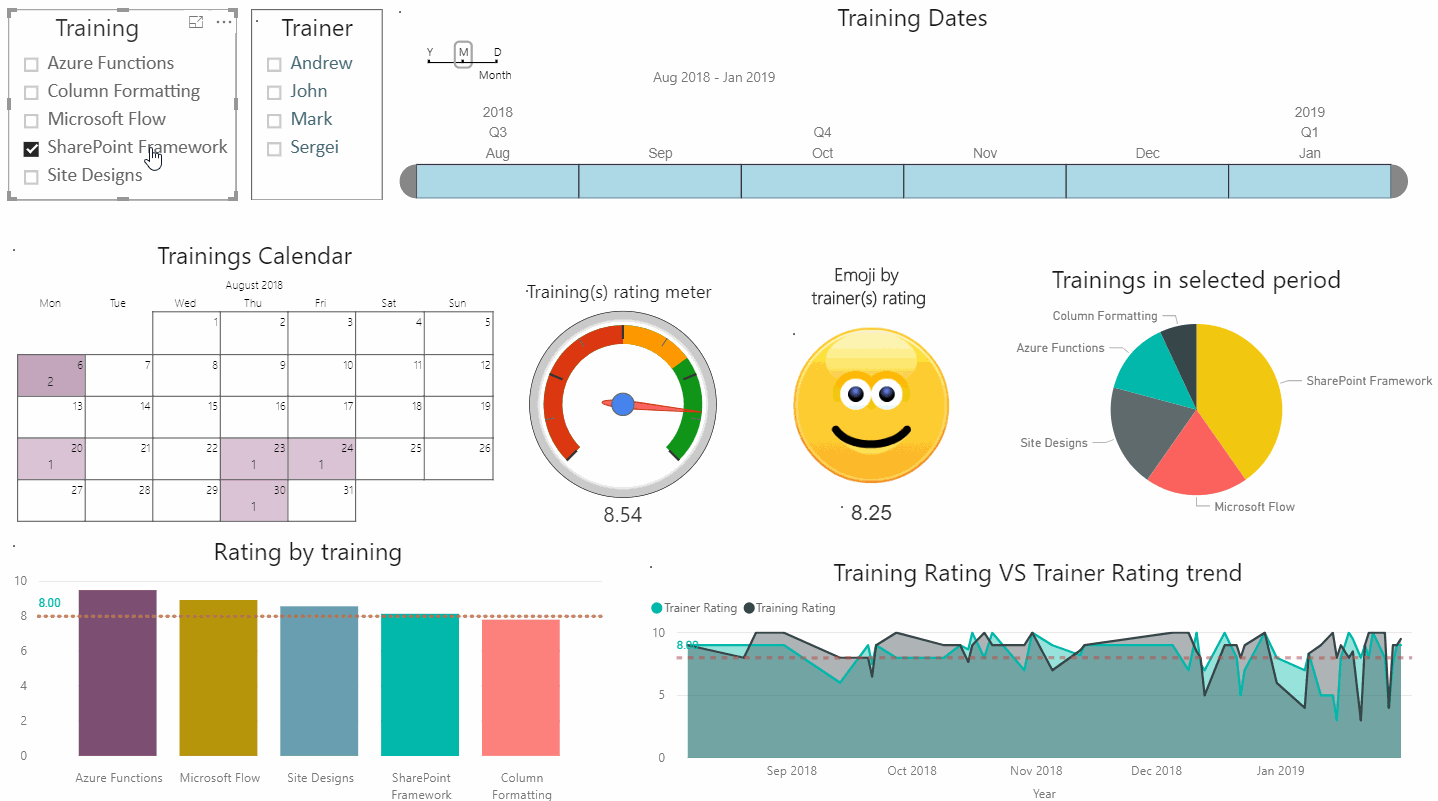 - Dynamic Emoji shows attendees satisfaction with a trainer. A rating of less than 5 is bad, 5-7 normal, 7-9 good and more than 9 is a star. You can filter to SharePoint Framework, select January in dates filter and go from 28 to 31th of January to see it in action.