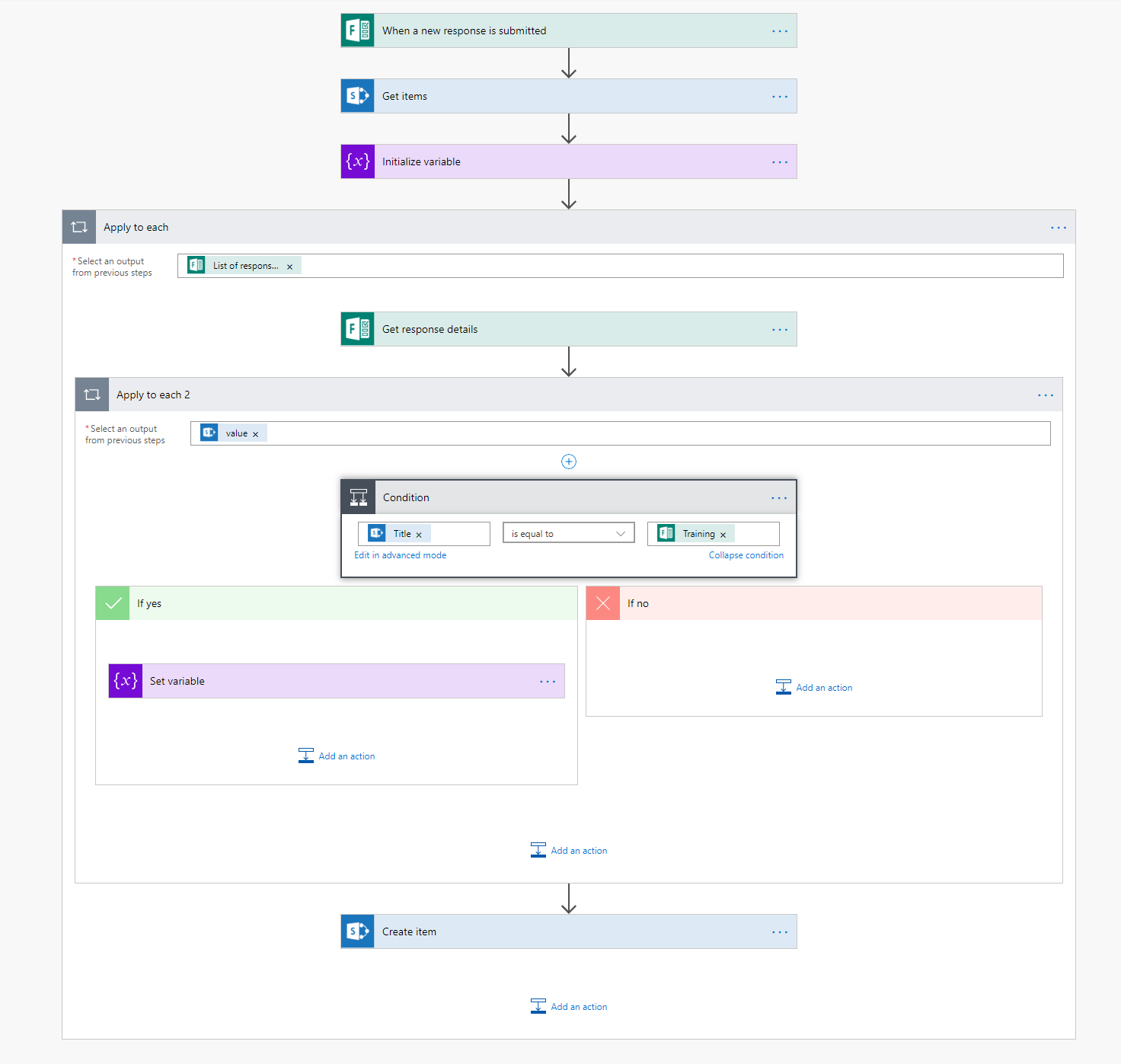 - For every new response, it searches for a corresponding item from the Trainings list (by title) and stores it in a variable TrainingId.