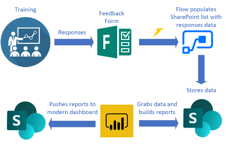 - Upon feedback form completion a Flow is triggered and fills in SharePoint list with data from feedback form.