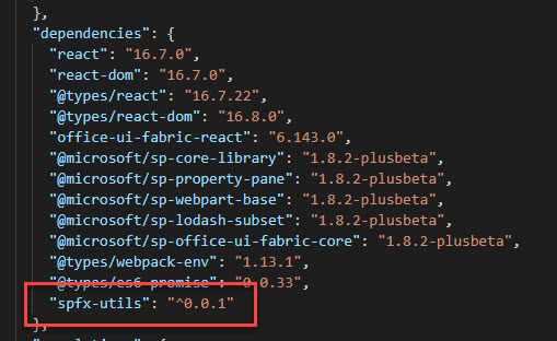 Next, we need to add a dependency to our org-app on our library component. To do that, open spfx-apps\org-app\package.json and add “spfx-utils”: “^0.0.1” line under “dependencies” node: