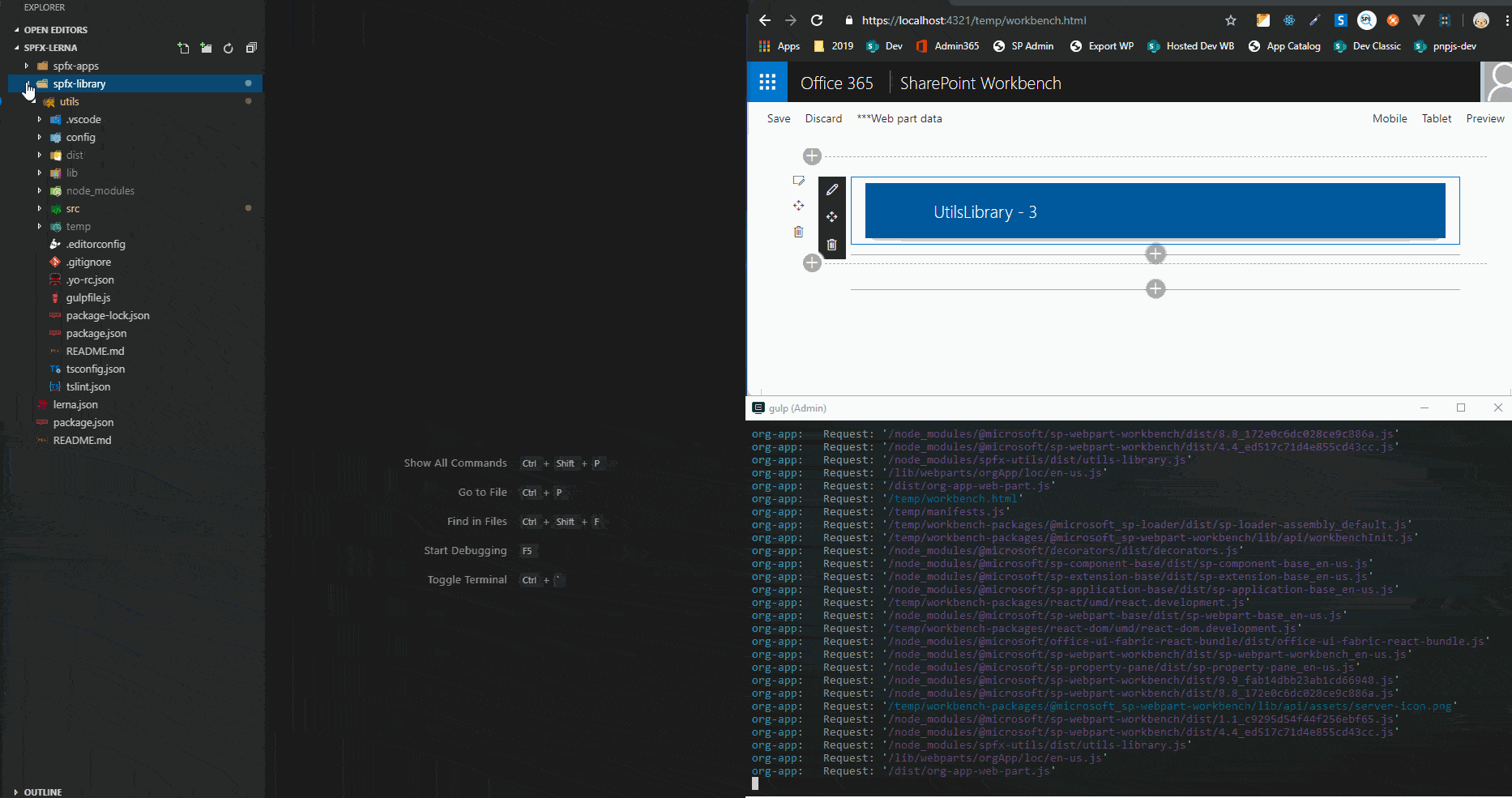 To make development maximum convenient possible, let’s make some updates to our library component and SharePoint Framework web part. We’re going to have “gulp serve” process running simultaneously for all packages. Once you change something in library component, SharePoint Framework projects immediately receive an update and refresh workbench.