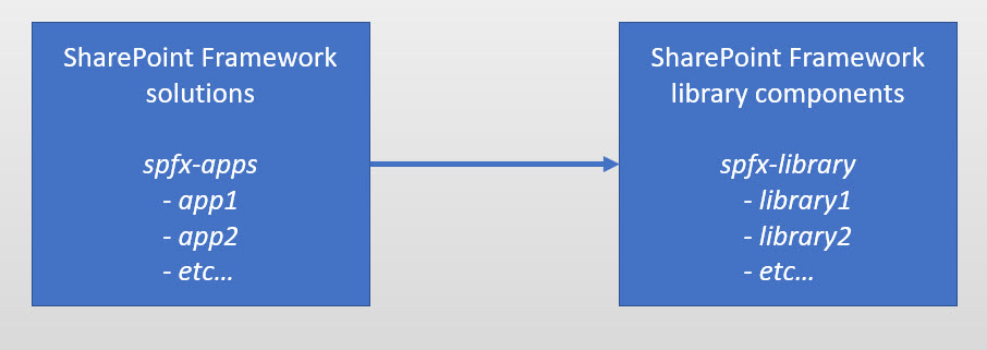 For our project, we need to folders - one with SharePoint Framework solutions and one with SharePoint Framework library components. Every solution is a package, every library component is a package. Schematically it looks like on the image below: