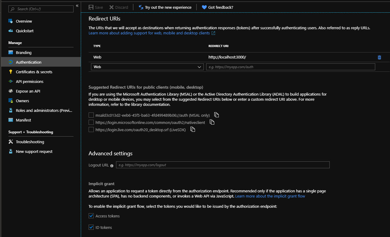 Go to your Azure AD portal and add a new app registration. You should add redirect url http://localhost:3000 (because later on, we’re using create react app). By default, the graph toolkit library uses Microsoft Authentication Library for JavaScript as the core component for authentication and access token requests. That’s why we should enable implicit flow in our app registration: