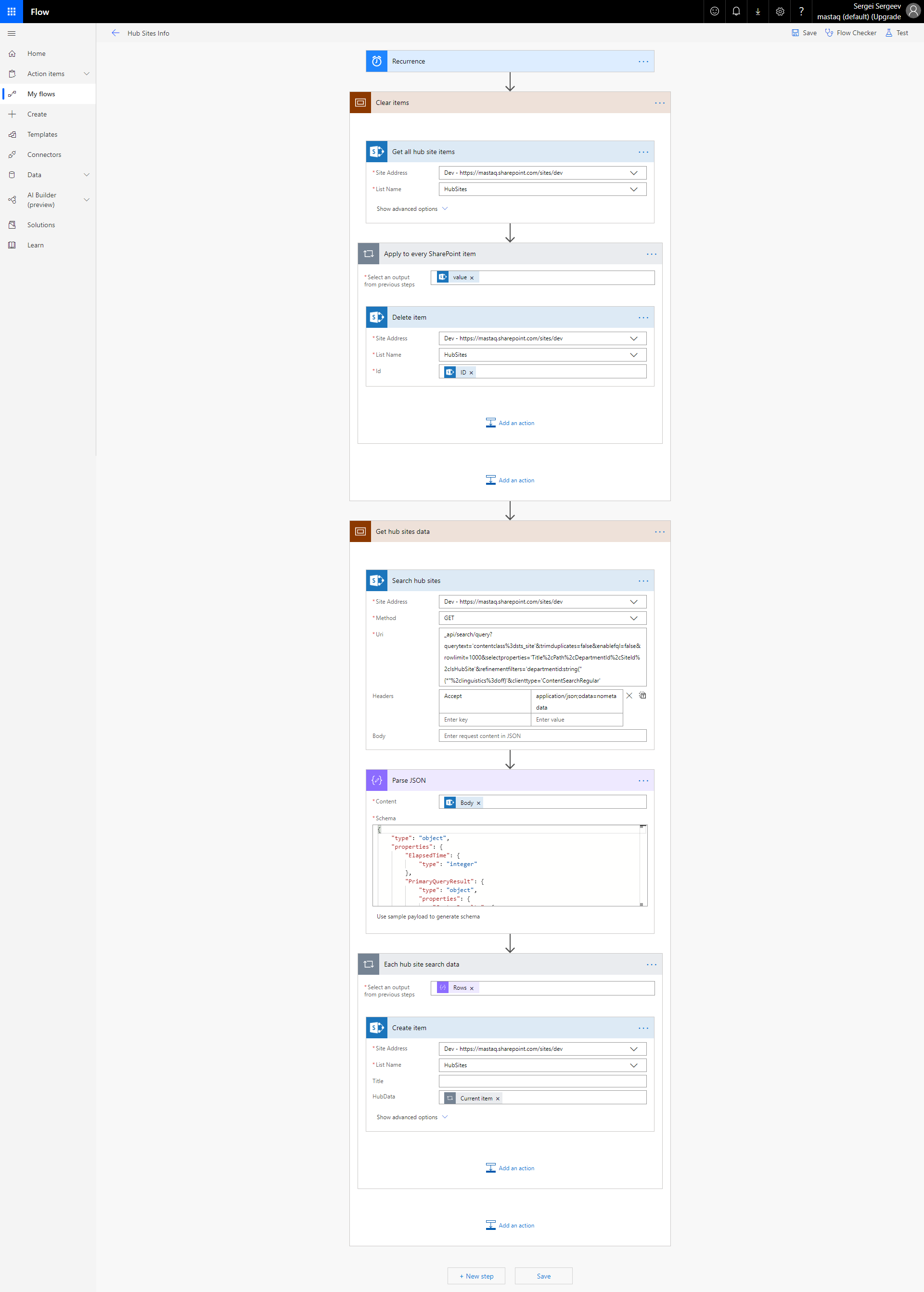 Create a new list in SharePoint with the only field HubData. Create a recurrent flow, which reads the data about your SharePoint hub sites using Search API. Please refer to Mikael Svenson’s post - Working with Hub Sites and the search API to find more info on how to do that. Basically, you should run below query: