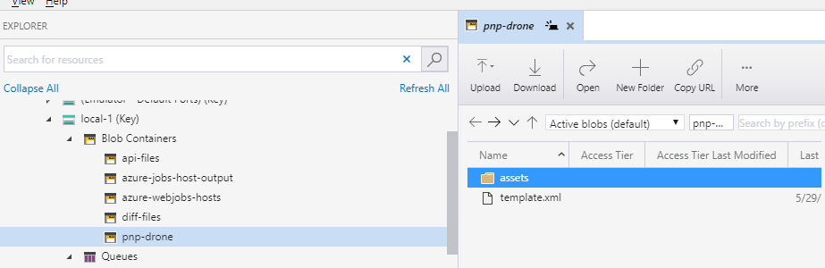 For PnP Provisioning I use the Contoso Drone Landing template. template.xml file and assets folder are both stored inside a blob called “pnp-drone”. Let’s go ahead and create a new blob and all required files (you can download them from GitHub’s link above). You can use Azure Storage Explorer to upload folders to Azure blobs. Here is how resulting blob looks like in Azure Storage Explorer: