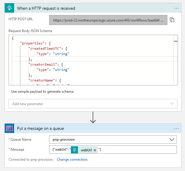 - An admin creates a new site collection using custom site design. The site design triggers an HTTP POST request to the Azure Logic app.