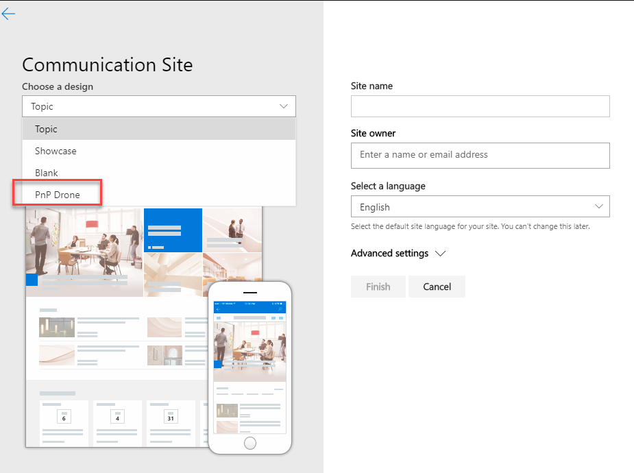 Add-SPOSiteDesign -Title "PnP Drone" -WebTemplate "68" -SiteScripts "<id of site script>" -Description "Drone site template for communication site"