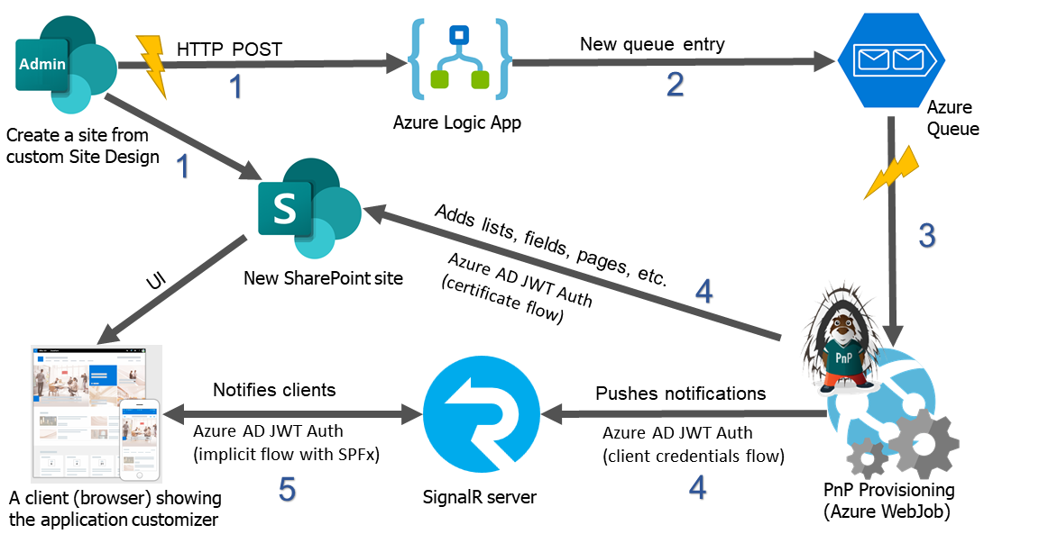 You have a custom SharePoint Site Design, which executes (through MS Flow or Azure Logic App) PnP Provisioning process. You want to notify users that the site is not fully ready yet and it’s still being updated (by background provisioning, which might take a long time). One option is to use two-way interactive communication between the SharePoint web site and the job using SignalR. That’s something we’re going to explore in this post in great detail.