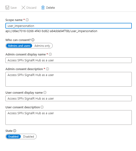 At this point, we configured our Azure AD app. We will use it later for authentication in the SignalR web app and from the application customizer.