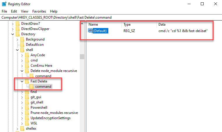 6. Right-click on a newly created “Fast Delete” folder, then New -> Key. Give it the name “command”.