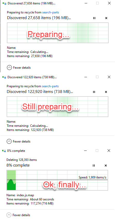 I’ve tried different options and found out, that rimraf works blazingly fast (suggested in the tweet above). Even when compared with the native windows command line “RMDIR”, rimraf somehow works 30% faster.