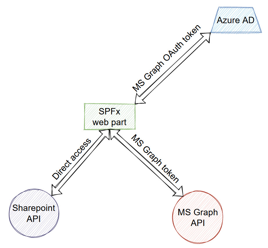 In order to access any organizational service, our HTTP request needs to be authenticated. Thus, every scenario includes authentication against APIs. In the current scenario, we can access SharePoint data directly, because normally an SPFx web part runs on a SharePoint page, i.e. on the same domain, as our SharePoint API. That’s why on the schema above you see “Direct access” for SharePoint API. Technically speaking, it doesn’t mean “no authentication”, because, under the hood, SPFx sends authentication cookies, attached to your logged-in user. So, authentication works, but we don’t need to care about it.