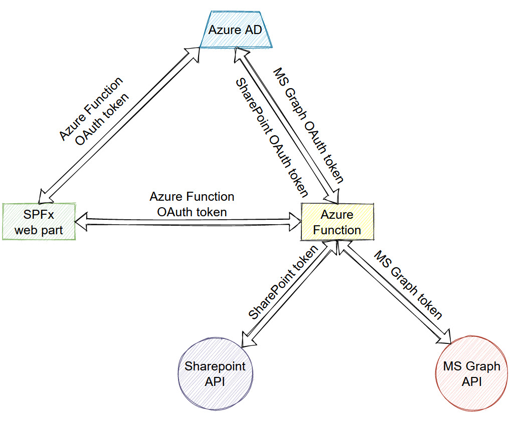 In this scenario, the SharePoint Framework web part doesn’t access SharePoint or MS Graph API directly. Instead, we talk to those APIs using backend code in Azure Function (might be any other web tech). Our Azure function is protected with Azure AD authentication, thus the web part uses OAuth implicit flow to get access token for Azure Function specifically. In Azure Function, we again talk to Azure AD and perform on-behalf-of flow in order to exchange Function access token for a token for another service (SharePoint, MS Graph, etc.). Using on-behalf-of flow we generate a user access token for organizational APIs and act on behalf of a currently logged in user.