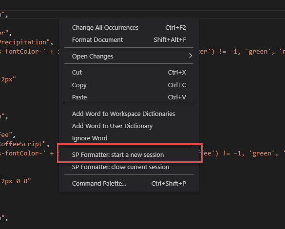 Now you should open any of your column formatting JSON files inside VSCode, right-click on that file, and select the “SP Formatter: start a new session” option: