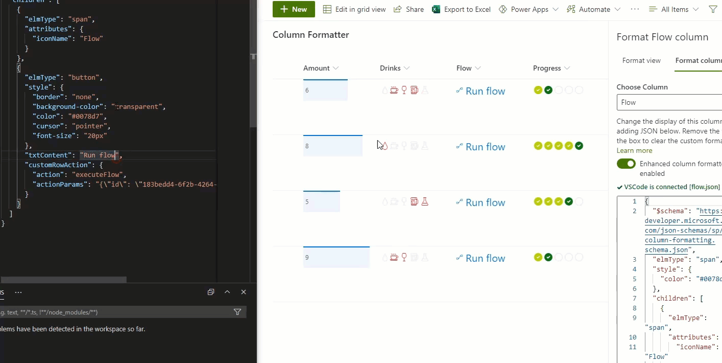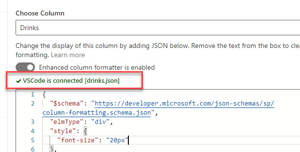 Now if you open a column formatting in a browser and enable SP Formatter, you will see a message, that VSCode is connected: