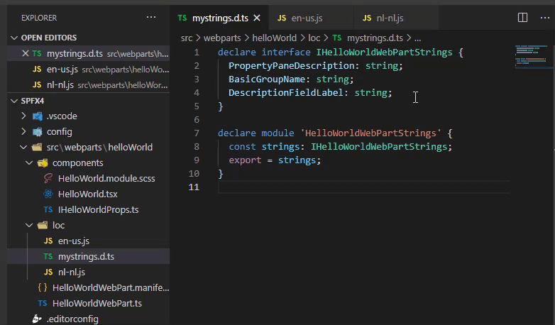 If you have and differences between your maser “mystrings.d.ts” and {locale}.js resource, the error will be immediately reported (including line and message). Using the addin you now have a clear visual indication that something is wrong with your localization files.