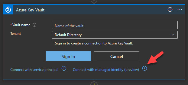 Select Key Vault connector, select “Get Secret” action, for authentication select “Connect with Managed Identity”. Currently, it’s in preview, if you would like not to use the preview feature, read further for an alternative method.