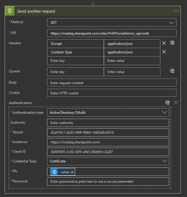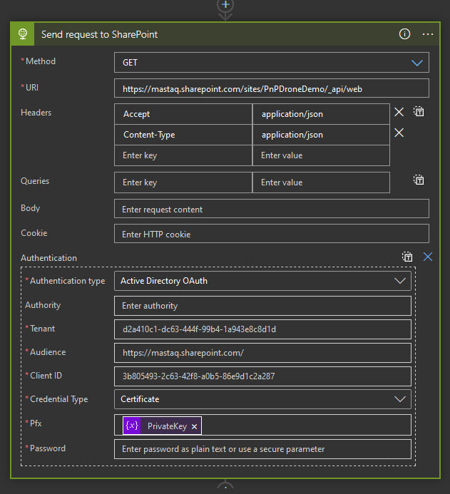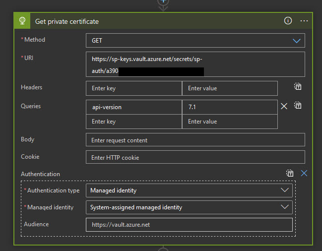 If you have a need to interact with SharePoint API from Power Automate \ Logic Apps, most likely you would select SharePoint connector, which uses user identity for authentication. However, it’s also possible to connect to SharePoint REST API with application permissions and certificate authentication. It’s fairly easy if you have an Azure Key Vault.