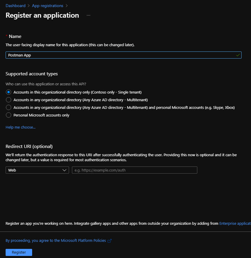 Then under authentication add a new Web platform. Use https://oauth.pstmn.io/v1/callback as a redirect Uri: