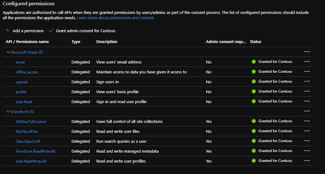 Under API permissions add necessary SharePoint API permissions. Under MS Graph also add offline_access permission, since it’s needed for the refresh tokens: