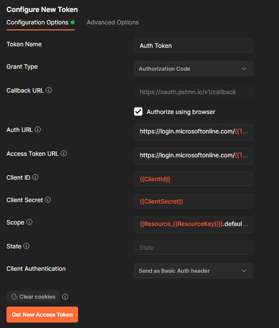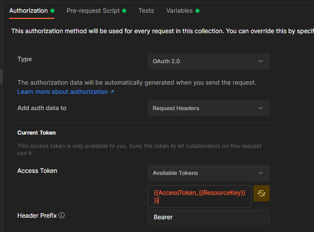 - Under Authorization tab update access token and set to be {{AccessToken_{{ResourceKey}}}}