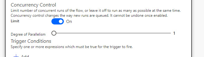 The flow is triggered by item created event. Under the trigger settings enable Concurrency control and set Degree of Parallelism to be 1. That way we have only one running instance of the flow at a time:
