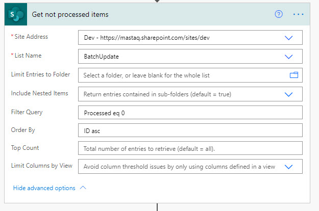 Then we should get all unprocessed items from the list (there will be at least one, but maybe more in case of batching, so we grab all of them). To do that we need to add a filter and order query in order to have items in the order of creation: